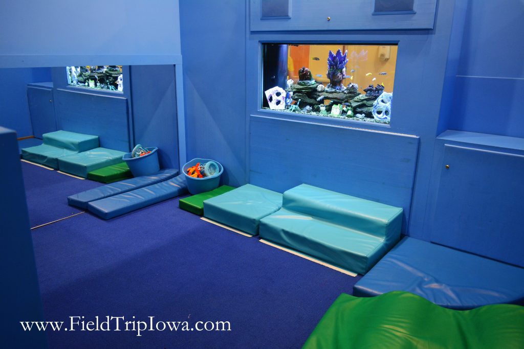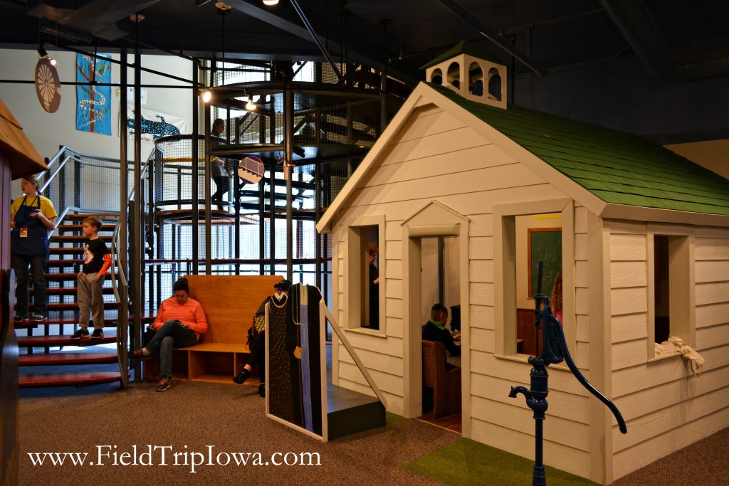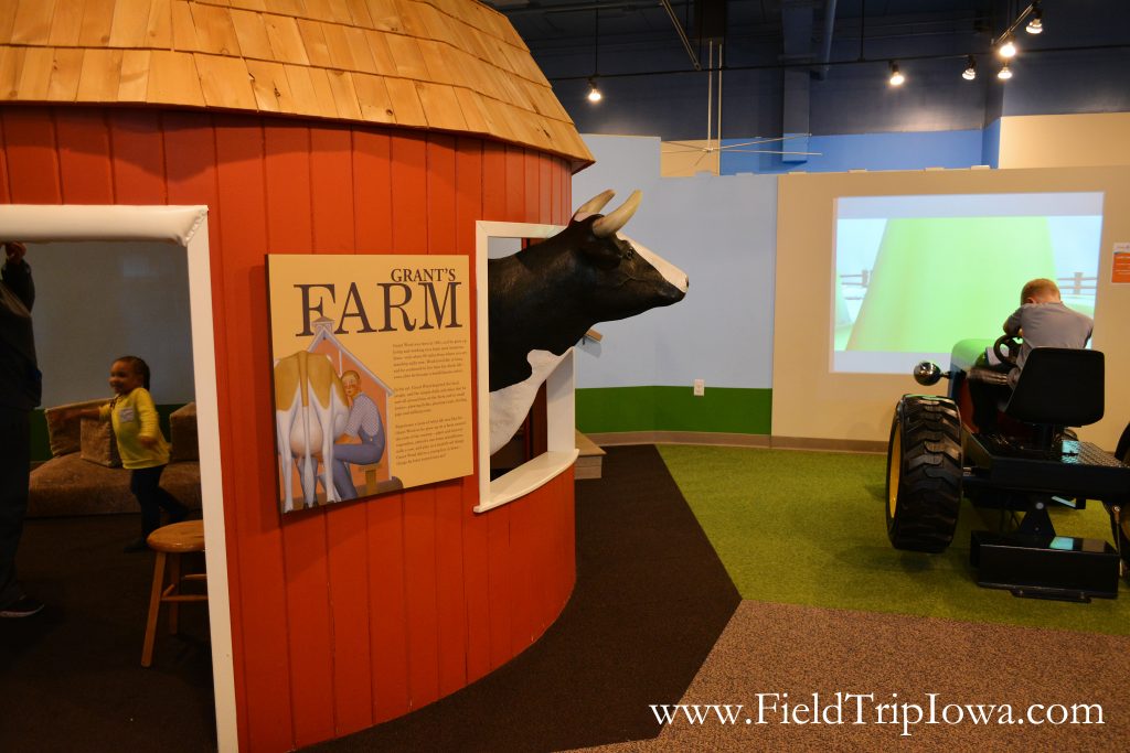 Grant Wood and Iowa farm life is a central theme on the main level. Children can drive a tractor into a digital Grant Wood painting, milk a cow in the barn or crawl through the rabbit holes under the stairs.